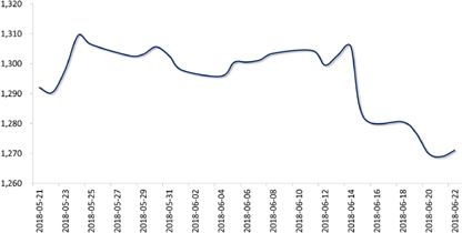 美联储加息步伐或将加快成为近期打压黄金的主要力量。上周,美联储主席再次发出鹰派讲话,推升市场对美联储年内4次加息的预期,金价承压下跌。截至上周收盘,COMEX黄金期货价格下跌0.85%至1271.1美元/盎司。