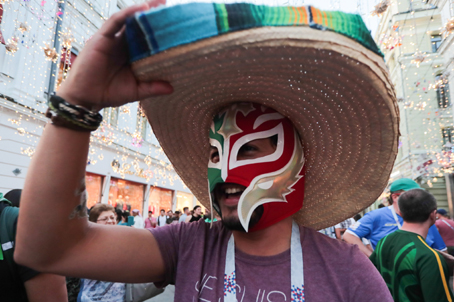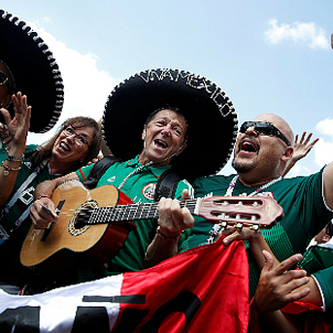 看台上墨西哥球迷载歌载舞,三个音节的“Ma-xi-co!”齐声助威,一股人浪从看台的墨西哥球迷聚集的北侧看台发起,当一部分球迷高举双手跳起来又坐下后,邻座的球迷就接着继续表演,人浪随之越滚越大,迅速像潮水一般席卷了整个看台。