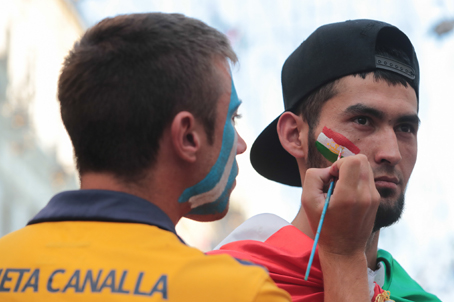 世界杯球迷在脸上涂抹油彩为支持的球队助威
