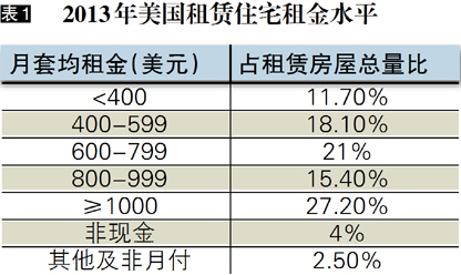 当前我国大多数城市的租金收益率一直在3%以下,住房租金回报率多数城市仅仅1-2%,企业很难通过商品房出租来建立起优质的盈利模式,从利润率的角度来说,这并不是一个可持续的市场。世联行2016年年报显示,包括长租公寓在内的资产服务业务,总体毛利率仅为2.32%。同时,房屋总价越高、面积越大,租金收益率越低。对比美国,绝大多数租赁住房的年租金/房价比处于3.4% - 8.2%区间,不同租金价位房屋占比相对均衡(如表1所示)。