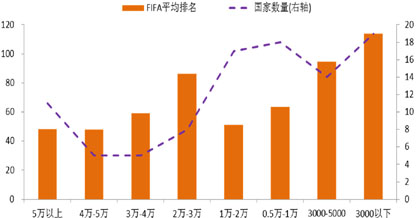 人均GDP较高的国家其足球世界排名的平均水平也较高。事实上,根据FIFA 2018年6月的排名,排名前十的国家,人均GDP最低的是巴西,为9895美元,其余国家均在1万美元以上。
