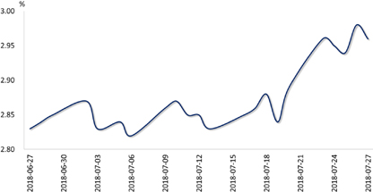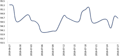 上周,美元指数V型反转。周三,因欧美贸易摩擦初步达成协议,欧元反弹,美元指数急跌0.4%;周四,欧洲央行公布利率决议,将维持低利率水平至明年夏天,欧元创下逾一个月来最大单日跌幅,美元指数顺势反弹,周五收于94.69,当周累计上涨0.23%。受国常会释放货币政策边际宽松信号影响,离岸人民币大幅下挫,在岸人民币跟随下行,盘中最低触及6.8390,创2017年6月27日以来新低,周五收于6.8246,当周累计下跌0.66%,预计人民币短期仍有调整压力。