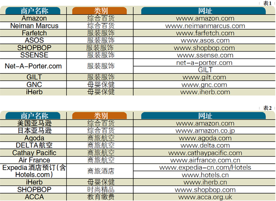 2018年7月1日至12月31日,报名后使用含Visa、万事达标识的龙卡信用卡(包括双标卡)通过Visa、万事达清算网络在美国亚马逊、ASOS、GNC、iHerb等十大海淘名店消费,享笔笔8%返现。返现金额每月计算一次,每持卡人每卡组织每月最高奖励60美元(万事达欧洲旅行卡为每持卡人每卡组织每月最高奖励51欧元),活动期间每卡组织限享2次。数量有限,先到先得。(表1)