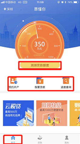 “首页”是功能入口和产品信息传递,用户可点击左上角可定位城市,点击“测测贷款额度”测算贷款额度,点击产品名称可了解相关产品详情,点击预约开户、我要贷款和进度查询,可进行具体操作。