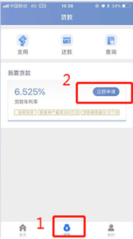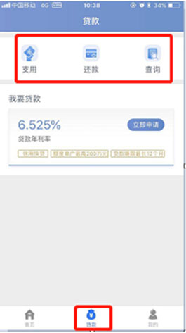 “贷款”界面,可进行贷款申请、贷款支用、还款、查询相关操作。