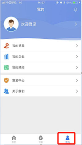 “我的”界面为用户提供各列表的快捷入口,供用户进行企业资料创建、安全设置、贷款信息查询以及预约信息查询、以及查看APP版本介绍等功能。