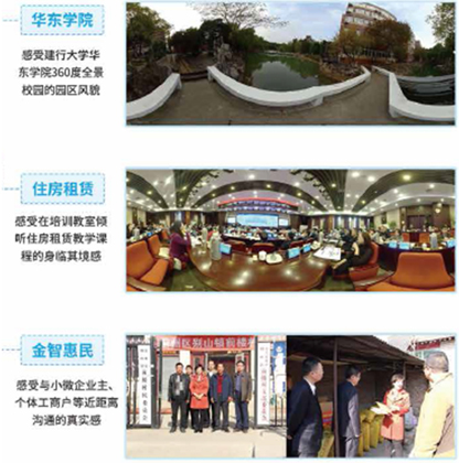 (1)VR/AR课堂。借助先进虚拟现实设备和专业设计力量,组织研发游戏化VR/AR实景课件,打破物理空间的局限,让学员足不出户就可以体验各种场景,让场景体验更真实,实战效果更理想。如:在华东学院湖畔读书,在远程教室学习住房租赁,赴贫困县参加金智惠民……