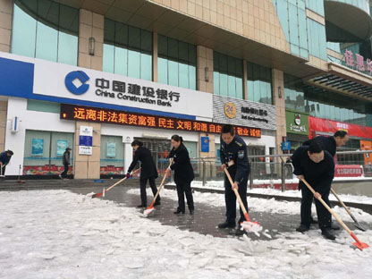 近日,湖南省各地连降大雪,为给客户提供一个安全的出行环境,怀化市分行员工提前到岗,认真清扫门前的积雪。■ 王承/摄