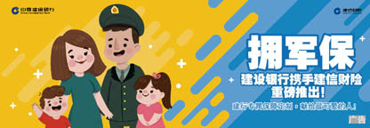 “拥军保”是建设银行和建信财险联手推出的为军人及军属提供多层次、多类别和长期均衡的专属保险保障。“拥军保”系列产品包括账户安全保障、人身意外保障、交通出行保障、航空意外保障、家庭财产安全保障。“拥军保”账户安全保险,为军保卡多一份资金安全保障,承保军人客户名下的所有建行账户(包括军人保障卡及辅卡、信用卡主卡及附卡、电子账户)挂失或冻结前48小时内的资金损失,保费低至2.5元,最高保额可达100万元。“拥军保”军属人身意外伤害保险,为军人家属定制人身意外安全保障,对军人家属因遭受意外伤害导致身故、伤残进行补偿,保费最低135元起,保额最高50万元。“拥军保”家庭财产保险,为军人及军属定制家庭房屋财产安全保障,对房屋及室内装潢、室内财产提供财产安全保障,保费最低40元起,最全豪华版套餐包括房屋、房屋装修、室内财产、水暖管破裂、三者、盗抢、现金珠宝盗抢系列保障。“拥军保”交通工具意外伤害保险,为军人及家属定制交通工具意外安全保障,对乘坐飞机、轮船、火车、汽车时遭受意外伤害进行补偿,保费最低64元起售,享受军人专享优惠价格。“拥军保”航空意外伤害保险,为军人及家属定制航空意外伤害安全保障,保障国内航线的航空意外及航空延误,分航次型和一年期型,保费最低10元起售,保额最高100万元。(季萱)