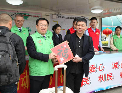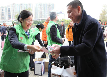 广东省东莞常平支行党支部联合志愿者组织在东莞火车东站开展“春运送暖”志愿服务活动,为在外拼搏一年返乡回家的群众送温暖献爱心,传递建行大爱。■ 莞宣/摄