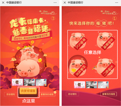 关注“龙卡信用卡”微信公众号,点击底部菜单“超值惠”-“新春领福猪”,进入活动页面。