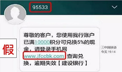 不法分子冒充银行、电信运营商等官方号码发送含有钓鱼链接的虚假短信,谎称积分可兑换现金,一旦点击链接并在虚假网页输入卡号、有效期、安全码、动态验证码等重要信息后,他们就可冒用你的身份盗用账户资金。