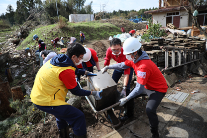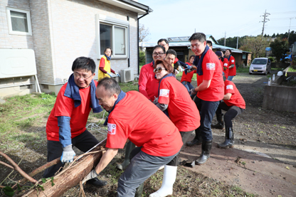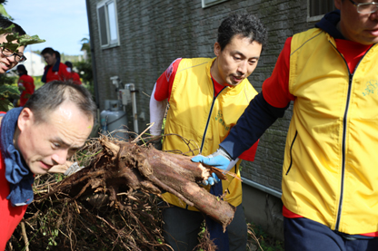 东京分行积极对接志愿者协会和社区机构,了解灾区需求和救助渠道,并在当地开放接受志愿者的首日,第一时间赶赴现场,开展志愿救援活动。他们帮助受灾民众清理受损房屋,包括吹散的屋顶、房梁以及散落各处的破碎瓦片、玻璃和垃圾,并按可燃和不可燃分类整理;他们清理被台风吹倒的树木,为灾民清理出农田和菜地,帮助灾民恢复农业生产。