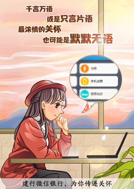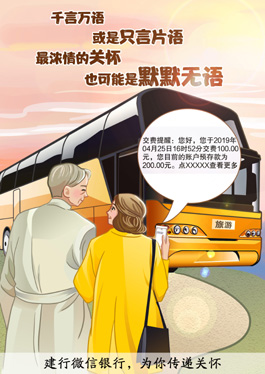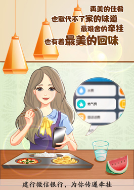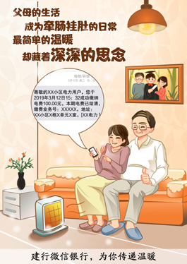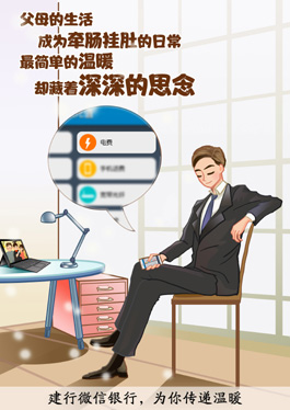 如今,小苏已经大学毕业,留在了学校所在的城市,忙碌的工作让小苏很少有机会陪伴父母身边。小苏是个孝顺的女孩,为了减少父母生活中的麻烦,她会定期为父母缴水费、电费和手机话费。这些事情看似简单,但如果没有便捷的渠道,对小苏这样的工作狂来说也并非易事。幸好小苏一直使用建行微信银行,通过悦生活为父母缴纳各种繁杂费用。小苏逢年过节回家的时候,还会抽空教父母也使用建行微信银行,体验便捷的账户查询、周边网点与预约等服务。对于小苏一家来说,时光虽然在流逝,但建行微信银行的陪伴一直都在。