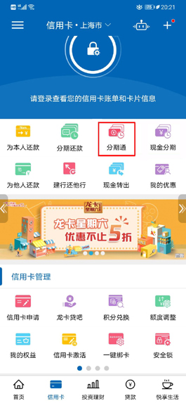 或登录建行手机银行,点击【信用卡】-【分期通】。