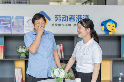 图为2019年9月2日,深圳市下乡学子黎咏菡参加建行大学华南学院“妈妈来电”项目,与清洁工陈阿姨在劳动者港湾交流谈心。关爱来深务工的妈妈群体,鼓励她们与留守家乡的孩子沟通,并分享电话沟通技巧。