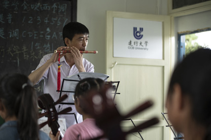 图为设立在贵州省六盘水市六枝特区凉水井村小学的“建行大学音乐教室”,李老师正用笛子示范吹奏《月光下的凤尾竹》。偏远山区的孩子们也可以享受到音乐带来的快乐和美好。