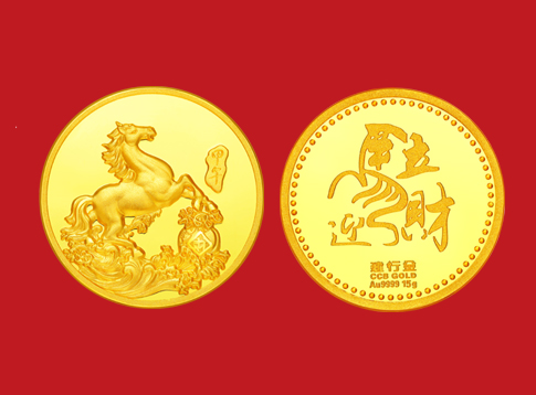古人认为马是财富和实力的象征,金章正面为骏马作飞驰状,踏于浪花之上四蹄翻腾,前蹄踩着聚宝财锦袋,高昂首,尾飞扬,寓意立马之下财富滚滚而来。