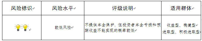 本期产品为非保本浮动收益型理财产品,不保证本金和收益,请您充分认识投资风险,谨慎投资。本期产品期限176天(中国建设银行有权对本期产品进行展期和提前终止),存续期内产品不接受申购或赎回申请。本期产品内部风险评级级别为2盏警示灯 ,风险程度属于较低风险。最不利情况下,资产组合无法回收任何本金和净收益,客户将损失全部本金。产品适合于收益型、稳健型、进取型、积极进取型客户。