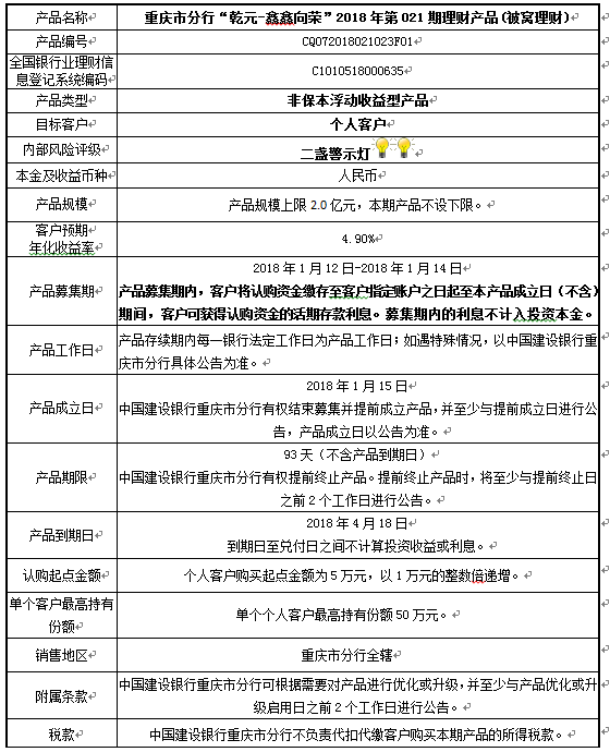 3.中国建设银行重庆市分行可根据市场情况等调整产品规模上、下限,并最迟于调整规模上下限当日进行公告。