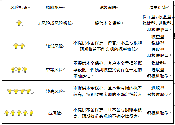 本产品为非保本浮动收益型理财产品,不保证本金和收益,请您充分认识投资风险,谨慎投资。本期产品期限为180天(中国建设银行有权对产品进行展期或提前终止),存续期内,产品不接受申购或赎回申请。本期产品内部风险评级级别为二盏警示灯风险水平属于较低风险。最不利情况下,您将损失全部收益甚至包括全部本金。本理财产品适用于收益型、稳健型进取型 积极进取型客户。