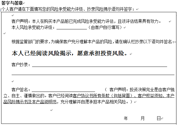 您签署本风险揭示书、客户协议书,并将资金委托给中国建设银行重庆市分行运作是您真实的意思表示。本风险揭示书及相应的客户协议书、产品说明书、客户权益须知将共同构成贵我双方理财合同的有效组成部分。
