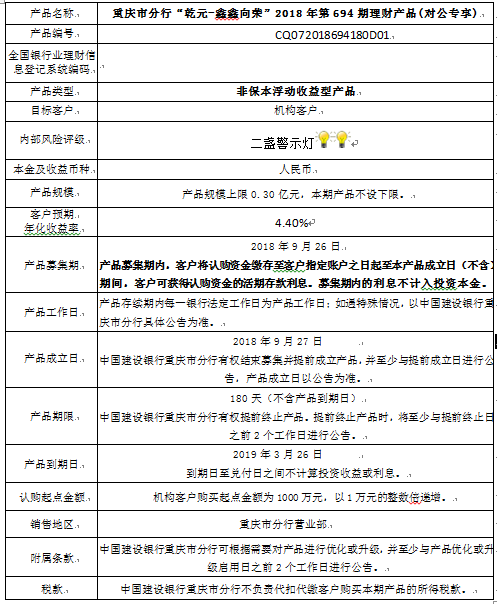 中国建设银行重庆市分行“乾元-鑫鑫向荣” 2018年第694期理财产品风险揭示书和产品说明书